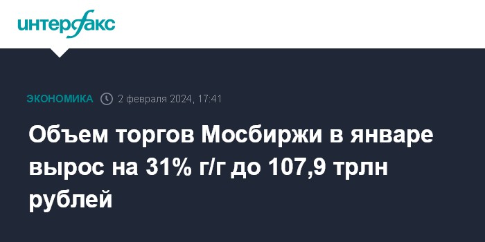 Объем торгов Мосбиржи в январе вырос на 31% г/г до 107,9 трлн рублей