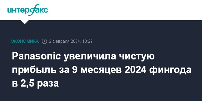 Москва. 2 февраля. INTERFAX.RU - Японский производитель бытовой электроники и аккумуляторов для электромобилей Panasonic Corp. увеличил чистую прибыль за 9 месяцев 2024 финансового года в 2,5 раза, выручку – на 1,2%.