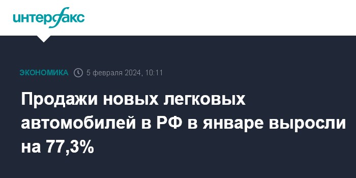 Москва. 5 февраля. INTERFAX.RU - Продажи новых легковых автомобилей в России в январе 2024 года выросли на "низкой базе" прошлого года на 77,3% по сравнению с январем 2023 года, до 80 212 штук, сообщило аналитическое агентство "Автостат" со ссылкой на данные АО "Паспорт промышленный консалтинг" (АО "ППК") - совместного предприятия агентства и оператора ЭПТС АО "Электронный паспорт".