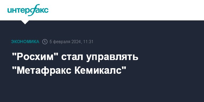 Москва. 5 февраля. INTERFAX.RU - АО "Росхим" (ранее - АО "Русский водород") с 1 февраля 2024 года назначено управляющей организацией АО "Метафракс Кемикалс", сообщается на сайте "Росхима".