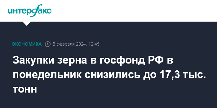 Москва. 5 февраля. INTERFAX.RU - Государство в понедельник закупило в интервенционный фонд 17,28 тыс. тонн зерна на 234,2 млн рублей, сообщается в пресс-релизе Национальной товарной биржи (НТБ, входит в группу Московская биржа).