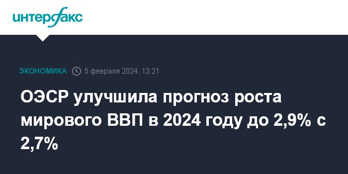 Москва. 5 февраля. INTERFAX.RU - Организация экономического сотрудничества и развития (ОЭСР) улучшила прогноз роста мировой экономики на 2024 год до 2,9% с ожидавшихся в ноябре 2,7%.