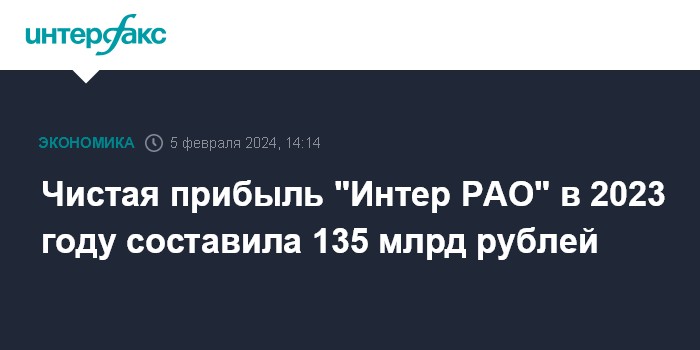 Чистая прибыль "Интер РАО" в 2023 году составила 135 млрд рублей