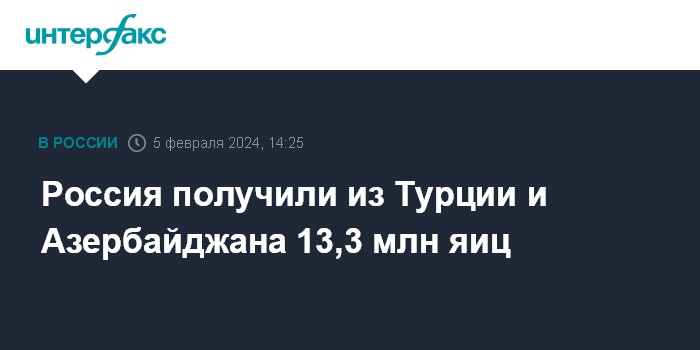 Москва. 5 февраля. INTERFAX.RU - Азербайджан и Турция к 5 февраля поставили в Россию 13,3 млн яиц, сообщает Россельхознадзор.