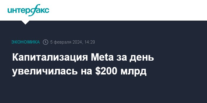 Москва. 5 февраля. INTERFAX.RU - Капитализация американской компании Meta (признана в России экстремистской организацией и запрещена) взлетела 2 февраля более чем на $200 млрд благодаря сильной отчетности и впервые объявленным дивидендам.