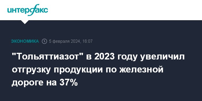 Москва. 5 февраля. INTERFAX.RU - "Тольяттиазот" (ТОАЗ) по итогам 2023 года увеличил объем отгрузки продукции железнодорожным транспортом на 37%, сообщает пресс-служба компании.