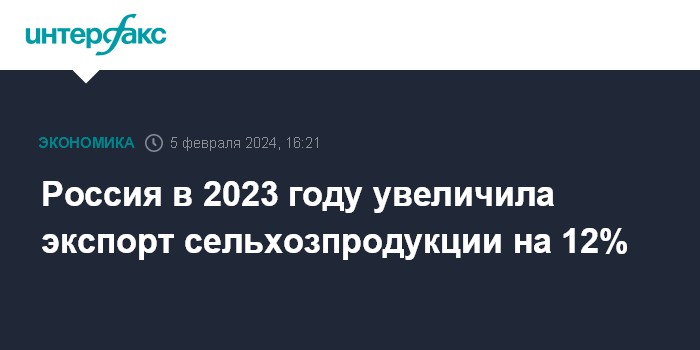 Россия в 2023 году увеличила экспорт сельхозпродукции на 12%