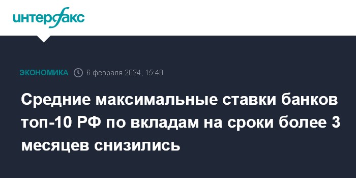 Москва. 6 февраля. INTERFAX.RU - Средние максимальные ставки банков топ-10 для всех категорий вкладов физлиц в рублях, сроки которых превышают три месяца, в третьей декаде января 2024 года снизились по сравнению с предыдущей декадой, следует из материалов на сайте Банка России.