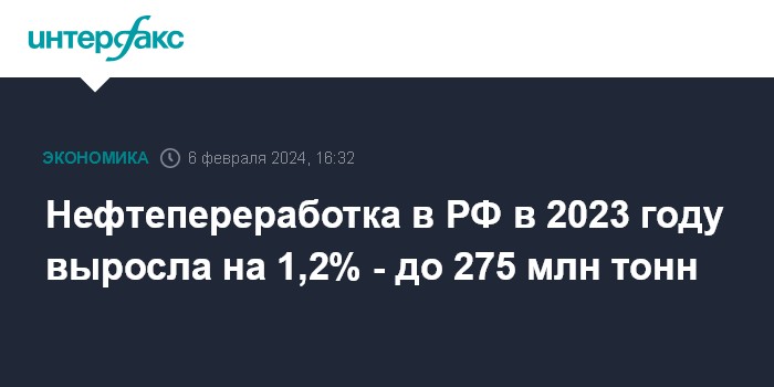 Москва. 6 февраля. INTERFAX.RU - Переработка нефти в РФ в 2023 году выросла по сравнению с 2022 годом на 1,2%, до 275 млн тонн, говорится в презентации вице-премьера Александра Новака, представленной в ходе "Открытого диалога" в Совете Федерации.