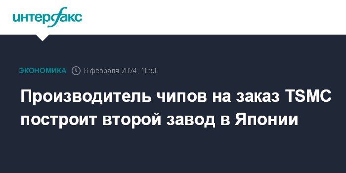 Москва. 6 февраля. INTERFAX.RU - Ведущий мировой производитель чипов на заказ Taiwan Semiconductor Manufacturing Company (SPB: TSM) (TSMC) при поддержке Sony, Denso и Toyota построит свой второй завод в Японии, говорится в пресс-релизе TSMC.