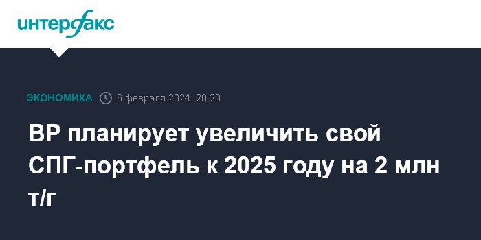 Москва. 6 февраля. INTERFAX.RU - Британская BP plc к 2025 году хочет увеличить свой портфель по сжиженному природному газу (СПГ) с 23 млн т в 2023 году до 25 млн т в 2025 году. Об этом сообщил глава компании Мюррей Окинклосс в ходе общения с инвесторами.