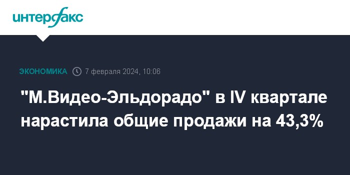 Москва. 7 февраля. INTERFAX.RU - ПАО "М.Видео" (группа "М.Видео-Эльдорадо") в IV квартале 2023 года увеличило общие продажи (GMV) на 43,3% год к году, до 181,1 млрд рублей, говорится в сообщении группы.