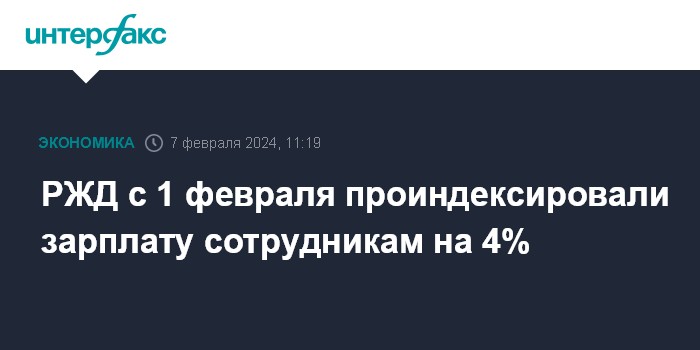 Москва. 7 февраля. INTERFAX.RU - ОАО "РЖД" с 1 февраля проиндексировало зарплату сотрудникам на 4%, сообщил холдинг.
