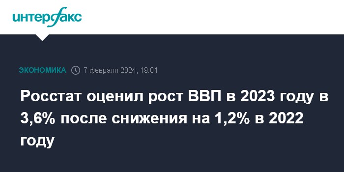 Москва. 7 февраля. INTERFAX.RU - ВВП РФ в 2023 году вырос на 3,6%. Такую первую оценку опубликовал в среду Росстат.