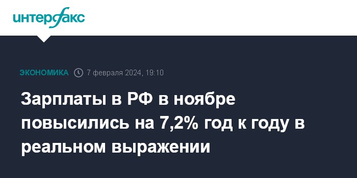 Зарплаты в РФ в ноябре повысились на 7,2% год к году в реальном выражении