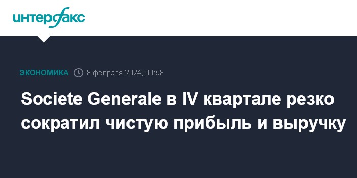 Москва. 8 февраля. INTERFAX.RU - Французский банк Societe Generale SA в четвертом квартале 2023 года сократил чистую прибыль более чем в два раза и уменьшил выручку на 10%.