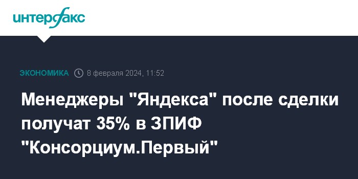 Москва. 8 февраля. INTERFAX.RU - ООО "ФМП" - структура, владельцами которой станут менеджеры "Яндекса" после разделения бизнеса - получит 35% в консорциуме ЗПИФ "Консорциум.Первый", который выступит покупателем российского бизнеса "Яндекса", говорится в презентации.