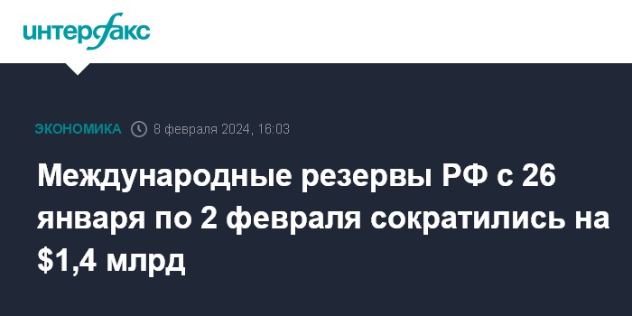 Международные резервы РФ с 26 января по 2 февраля сократились на $1,4 млрд
