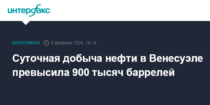 Москва. 8 февраля. INTERFAX.RU - Среднесуточный уровень добычи нефти в Венесуэле превысил 900 тысяч баррелей, сообщает национальная нефтяная компания Petroleos de Venezuela S.A. (PDVSA) со ссылкой на министра нефти Педро Теллечеа.