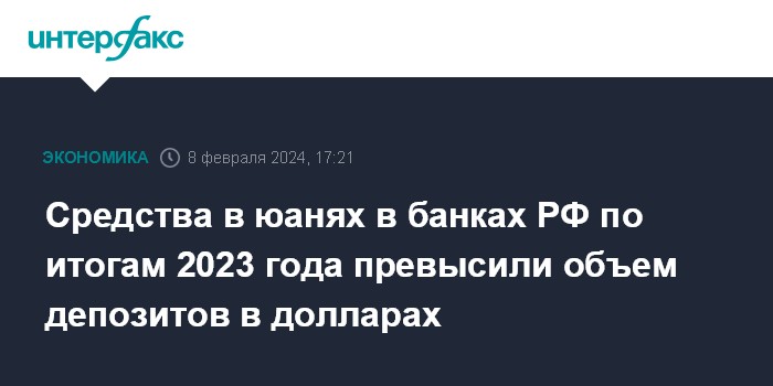 Средства в юанях в банках РФ по итогам 2023 года превысили объем депозитов в долларах