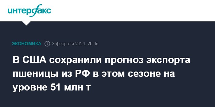 Москва. 8 февраля. INTERFAX.RU - Минсельхоз США в февральском обзоре сохранил на уровне января прогнозы экспорта пшеницы из РФ и ее сбора в этом сельхозгоду (июль 2023 - июнь 2024 гг.).