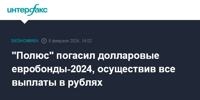Москва. 9 февраля. INTERFAX.RU - Золотодобывающая компания "Полюс" погасила долларовые еврооблигации-2024 и выплатила последний купон по ним, осуществив платежи всем категориям держателей в рублях, следует из ее сообщения.