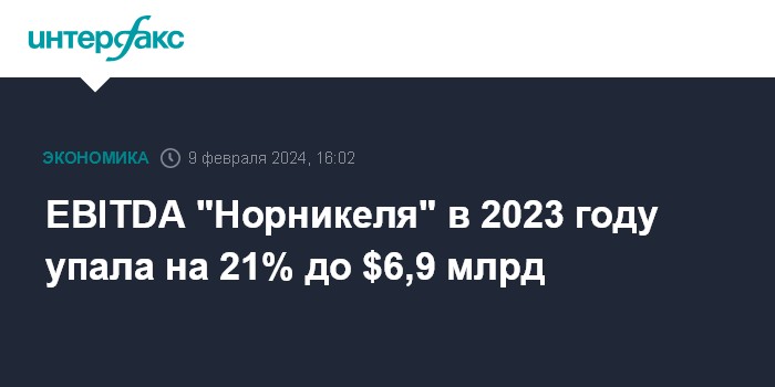 Москва. 9 февраля. INTERFAX.RU - EBITDA "Норильского никеля" в 2023 году снизилась на 21% вследствие сокращения выручки, составив $6,9 млрд, сообщила компания.