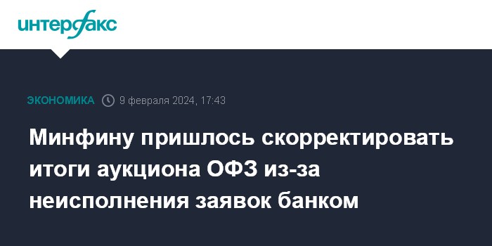 Минфину пришлось скорректировать итоги аукциона ОФЗ из-за неисполнения заявок банком
