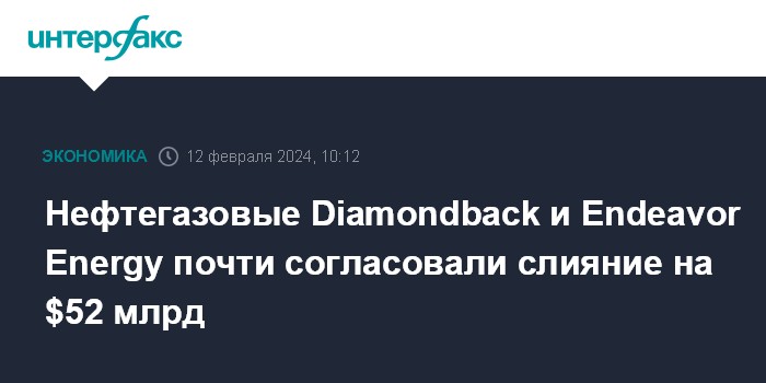 Москва. 12 февраля. INTERFAX.RU - Американские нефтегазовые Diamondback Energy и Endeavor Energy Resources почти согласовали условия своего объединения, пишет The Wall Street Journal со ссылкой на информированные источники.
