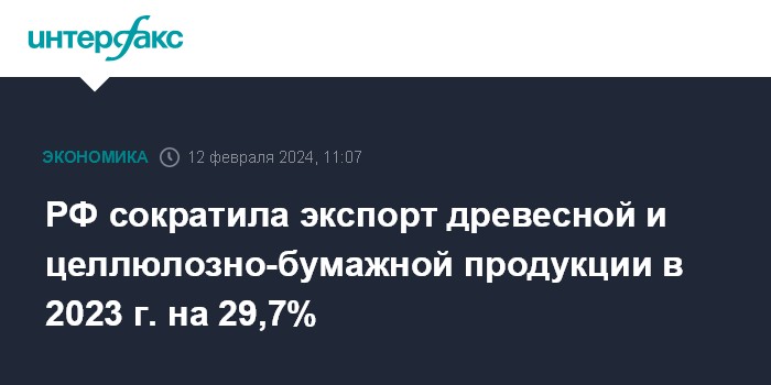 РФ сократила экспорт древесной и целлюлозно-бумажной продукции в 2023 г. на 29,7%