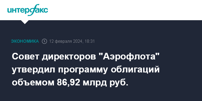 Совет директоров "Аэрофлота" утвердил программу облигаций объемом 86,92 млрд руб.