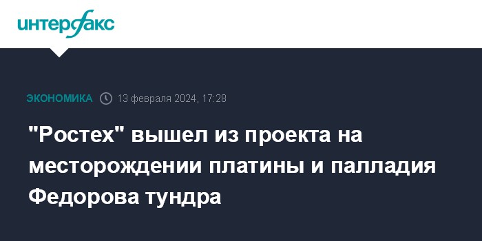 Москва. 13 февраля. INTERFAX.RU - "Ростех" вышел из проекта по освоению месторождения металлов платиновой группы (МПГ) Федорова тундра.