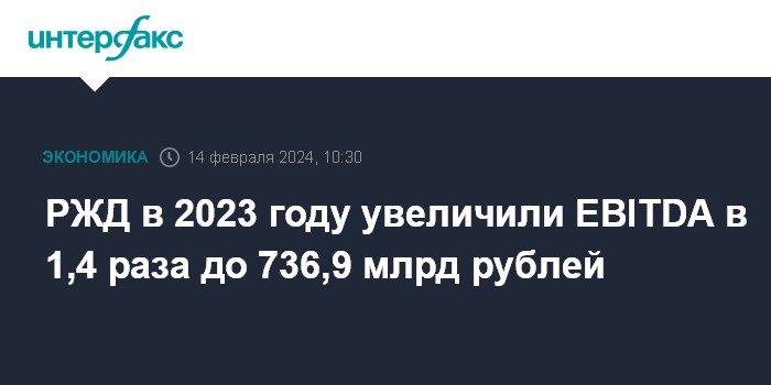 Москва. 14 февраля. INTERFAX.RU - ОАО "РЖД" в 2023 году увеличило EBITDA в 1,4 раза к уровню 2022 года, до 736,9 млрд рублей. Об этом говорится в презентации главы компании Олега Белозерова к итоговому за 2023 год заседанию правления.