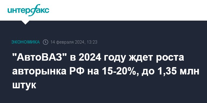 Москва. 14 февраля. INTERFAX.RU - Рынок легковых и легких коммерческих автомобилей в России с учетом альтернативных каналов ввоза машин в 2024 году может вырасти на 15-20%, до 1,3-1,35 млн единиц, прогнозирует "АвтоВАЗ".