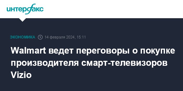 Москва. 14 февраля. INTERFAX.RU - Американская Walmart Inc., крупнейшая в стране компания розничной торговли, ведет переговоры о покупке производителя смарт-телевизоров Vizio Holdings Corp. более чем за $2 млрд, пишет газета The Wall Street Journal со ссылкой на информированные источники.