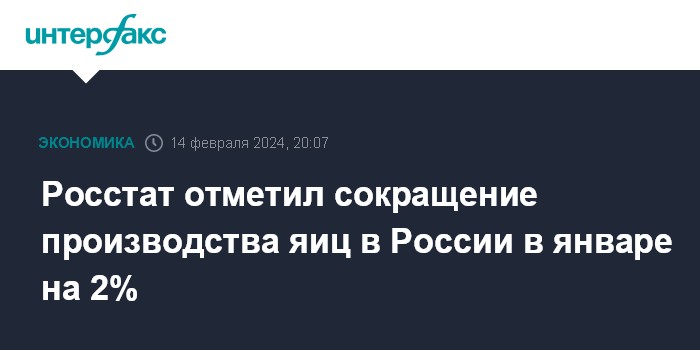 Москва. 14 февраля. INTERFAX.RU - Российские птицеводческие предприятия в январе произвели 3,174 млрд яиц, что на 2% меньше, чем в январе прошлого года (3,239 млрд штук), сообщается в материалах Росстата.