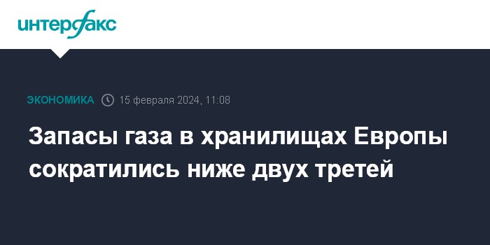 Москва. 15 февраля. INTERFAX.RU - Текущий уровень запасов газа в подземных хранилищах Европы опустился ниже двух третей - сейчас он на отметке 66,22%. Тем не менее, это рекордный уровень на ту же дату за историю наблюдений - последние полтора десятка лет.