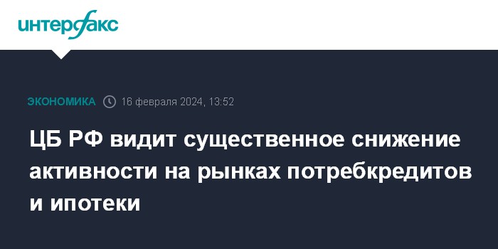 Москва. 16 февраля. INTERFAX.RU - ЦБ РФ отмечает существенное снижение активности на рынках необеспеченного потребительского кредитования и ипотеки, первые признаки замедления демонстрирует корпоративное кредитование, говорится в пресс-релизе Банка России по итогам заседания совета директоров.