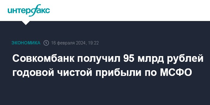Москва. 16 февраля. INTERFAX.RU - Чистая прибыль Совкомбанка по МСФО в 2023 году составила 95 млрд рублей, сообщил телеграм-канал банка и назвал показатель рекордным.