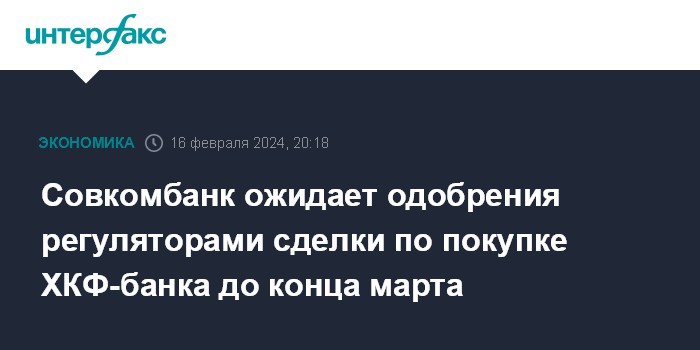 Москва. 16 февраля. INTERFAX.RU - Совкомбанк до конца первого квартала 2024 года ожидает получить одобрения от регуляторов, необходимые для сделки по покупке ХКФ-банка (Хоум банка), заявил на конференц-колле зампред банка Сергей Хотимский.