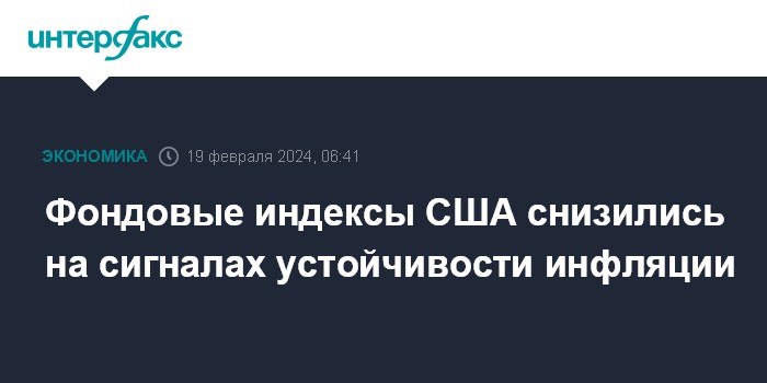 Москва. 19 февраля. INTERFAX.RU - Американские фондовые индексы снизились в пятницу после публикации статданных, показавших устойчивость инфляции в США, а также спад активности на рынке жилья.