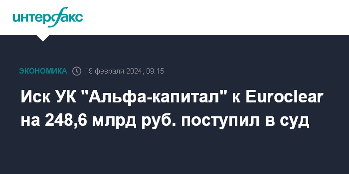 Москва. 19 февраля. INTERFAX.RU - УК "Альфа-капитал" подала в Арбитражный суд Москвы иск к Euroclear Bank на 248,636 млрд рублей, следует из материалов картотеки дел.