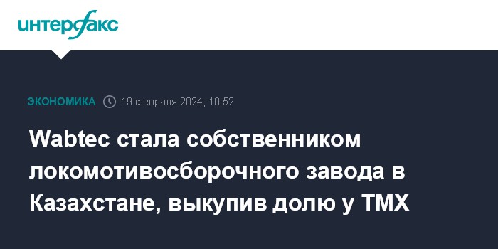 Москва. 19 февраля. INTERFAX.RU - Американская Wabtec приобрела 50% акций локомотивосборочного завода АО "Локомотив курастыру зауыты" (ЛКЗ) за $81 млн, став единственным владельцем предприятия, говорится в финансовой отчетности компании.