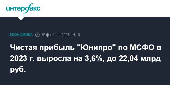 Москва. 19 февраля. INTERFAX.RU - Чистая прибыль ПАО "Юнипро" по МСФО в 2023 году выросла на 3,6% по сравнению с 2022 годом, до 22,04 млрд рублей, говорится в отчете компании.