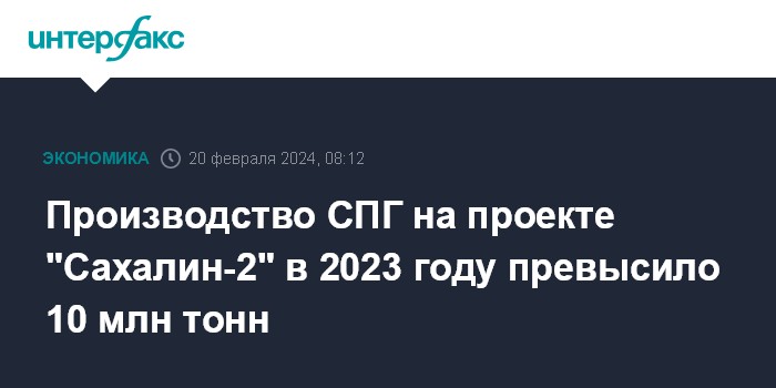 Москва. 20 февраля. INTERFAX.RU - Оператор проекта "Сахалин-2" - ООО "Сахалинская энергия" - в 2023 году произвел более 10 млн тонн СПГ (160 стандартных партий) после 11,5 млн тонн в 2022 году, сообщается в материалах компании.
