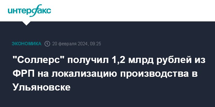 Москва. 20 февраля. INTERFAX.RU - Дочернее предприятие группы "Соллерс" в Ульяновской области - ООО "Компоненты системы безопасности" (КСБ) - получило льготный заем Фонда развития промышленности (ФРП) в размере 1,2 млрд рублей на локализацию производства компонентов систем пассивной безопасности, сообщила головная компания группы.