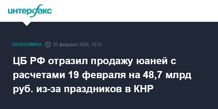 ЦБ РФ отразил продажу юаней с расчетами 19 февраля на 48,7 млрд руб. из-за праздников в КНР
