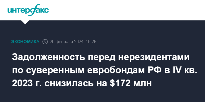 Задолженность перед нерезидентами по суверенным евробондам РФ в IV кв. 2023 г. снизилась на $172 млн