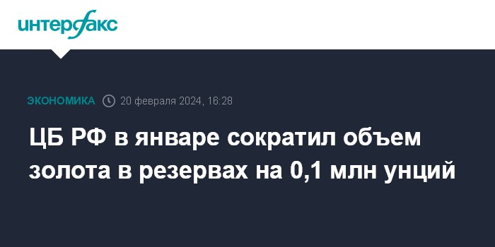 Москва. 20 февраля. INTERFAX.RU - Банк России в январе сократил объем золота в резервах на 0,1 млн унций (это примерно пара тонн драгметалла, формат данных ЦБ РФ не позволяет дать более точную оценку).