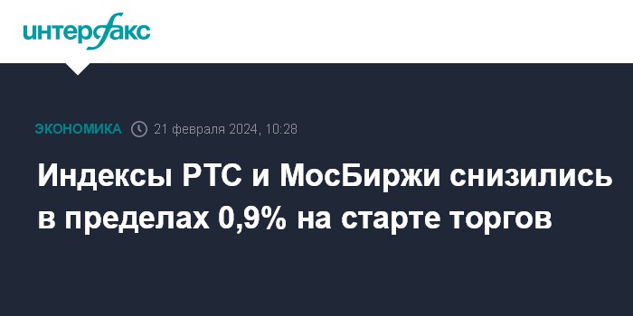 Индексы РТС и МосБиржи снизились в пределах 0,9% на старте торгов